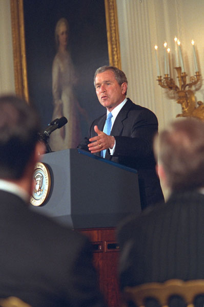 US-Präsident George W. Bush bei seiner Rede vor den Technologie-Managern im East Room. Foto: By White House photo by Paul Morse. - https://georgewbush-whitehouse.archives.gov/news/releases/2001/03/images/20010328-2b.html, Public Domain, https://commons.wikimedia.org/w/index.php?curid=174032376.